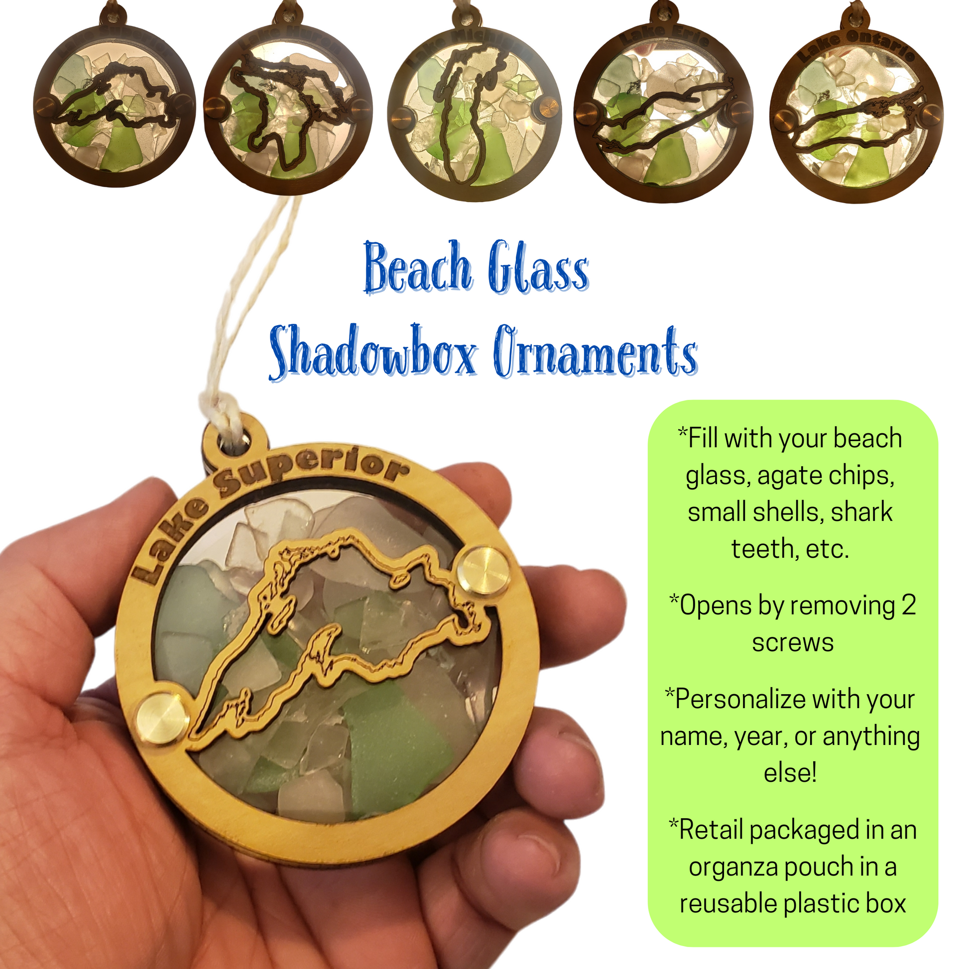 Fill your shadowbox ornament with sea glass, agate chips, small shells, beads, pompoms, etc.