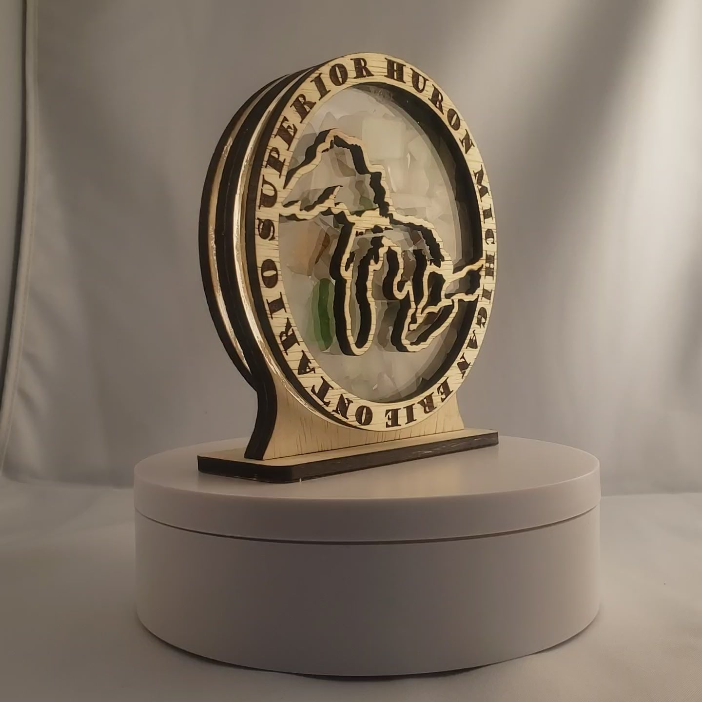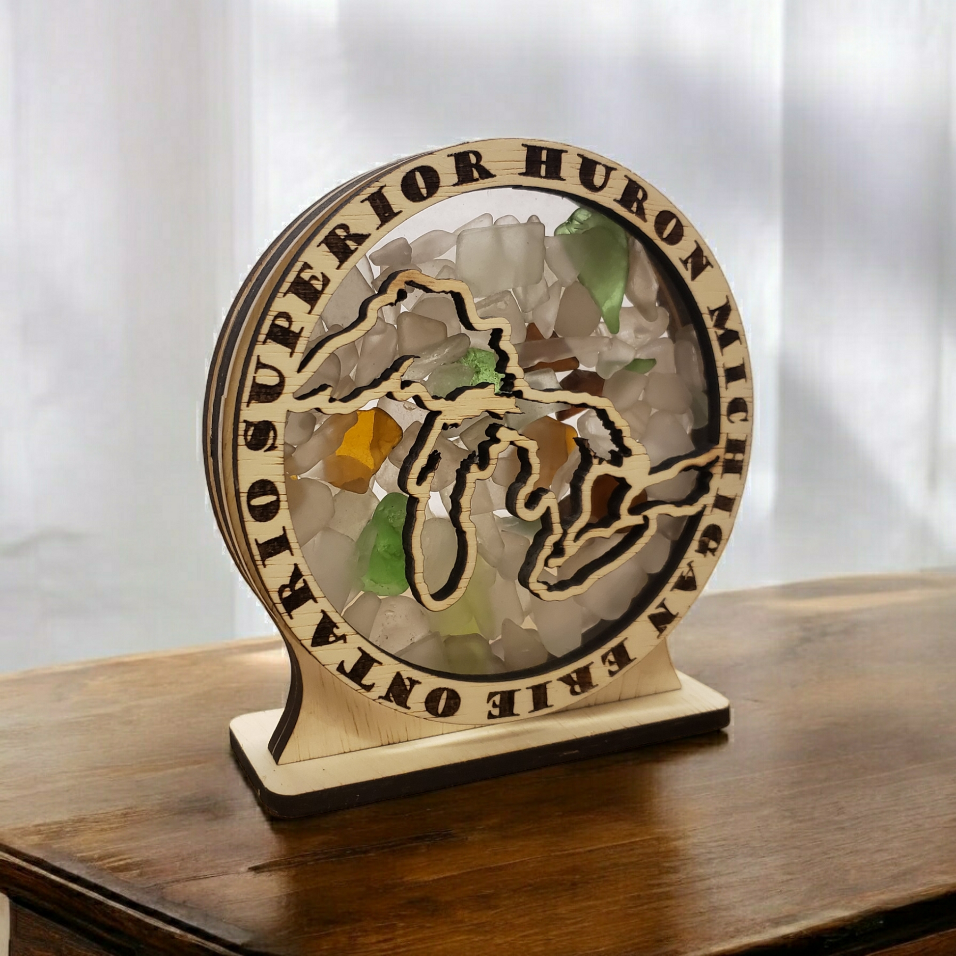 Great Lakes Sea Glass Shadowbox Display Single Sided, Window Hanging, Double Sided Shine-Through Shelf Sitter, Led Light, Small Celebrate the stunning charm of the Great Lakes right in your home with our captivating Round Sea Glass Shadowbox! This exquisite display captures the essence of these majestic waters, transforming handpicked treasures into a unique piece of art that radiates coastal bliss.