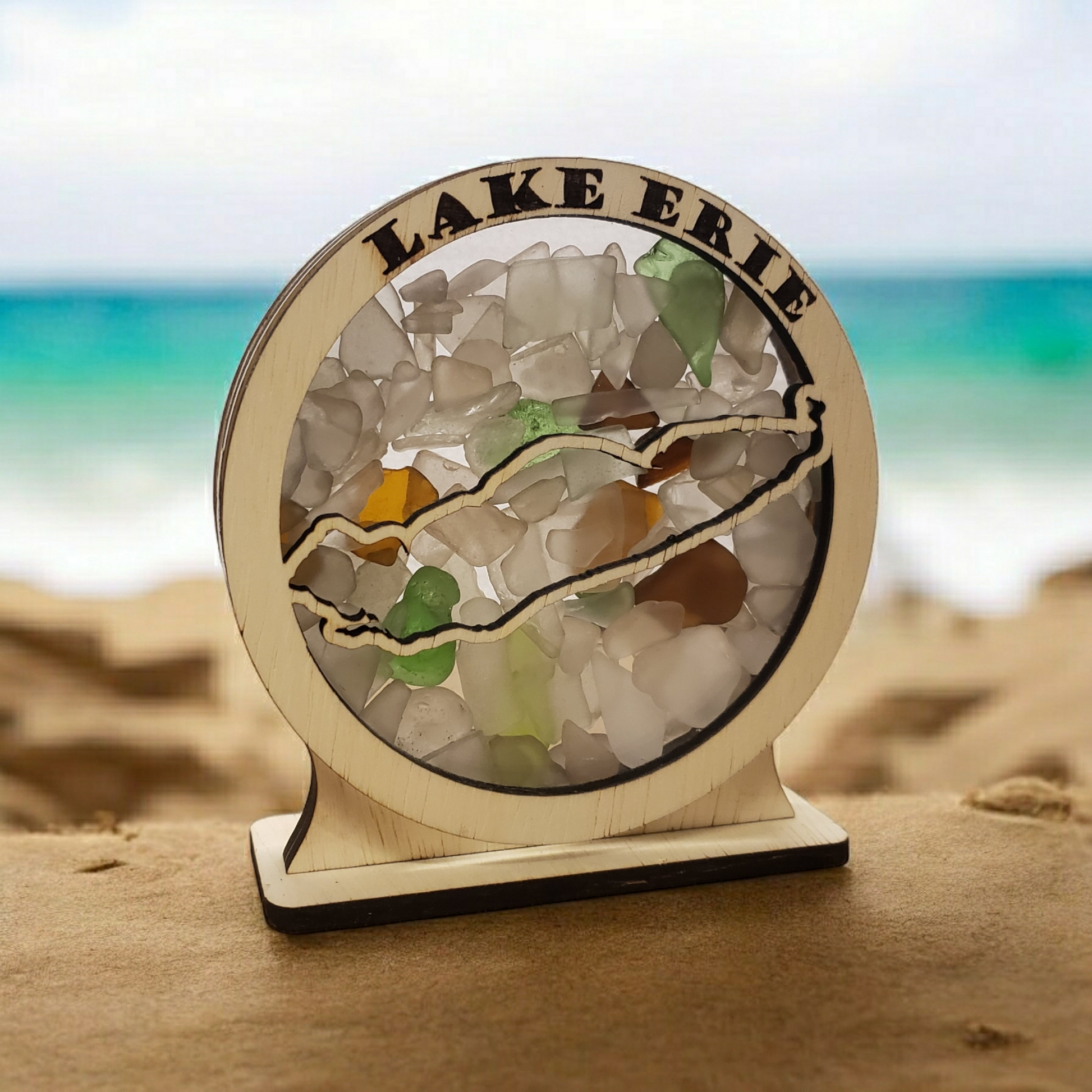 Lake Erie Sea Glass Shadowbox Display Single Sided, Window Hanging, Double Sided Shine-Through Shelf Sitter, Led Light, Small Bring the vibrant beauty of Lake Erie right into your home with our stunning Round Sea Glass Shadowbox! This delightful display captures the essence of the lake’s shimmering waters, transforming handpicked treasures into a captivating piece of art that brightens any room.