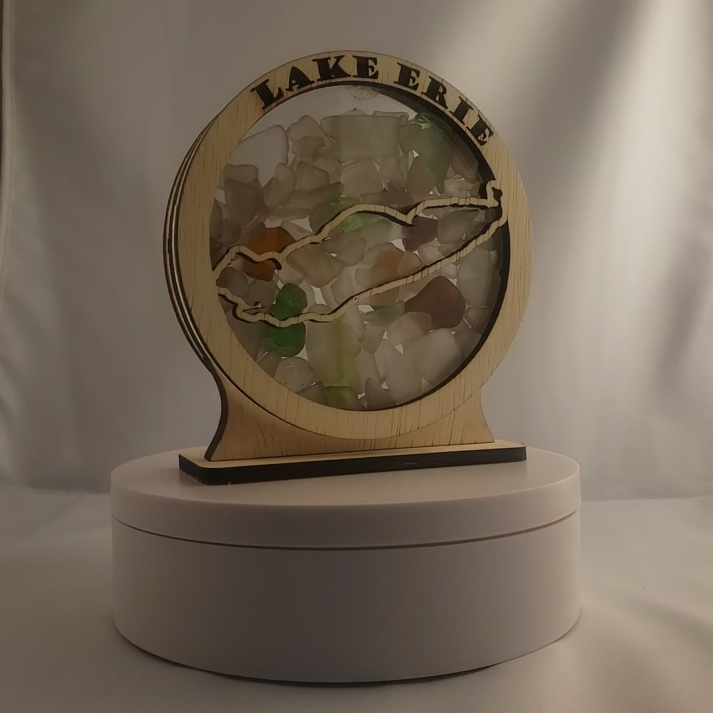 Lake Erie Round Sea Glass Shadowbox Display Single Sided, Window Hanging, Double Sided Shine-through Shelf Sitter, LED Light, Small