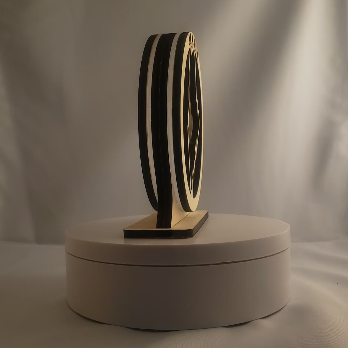 Choose from 4 display styles: *Single Sided with wood back *Double sided with clear acrylic back *Window Hanging with included suction cup *LED Night Light base with Remote control