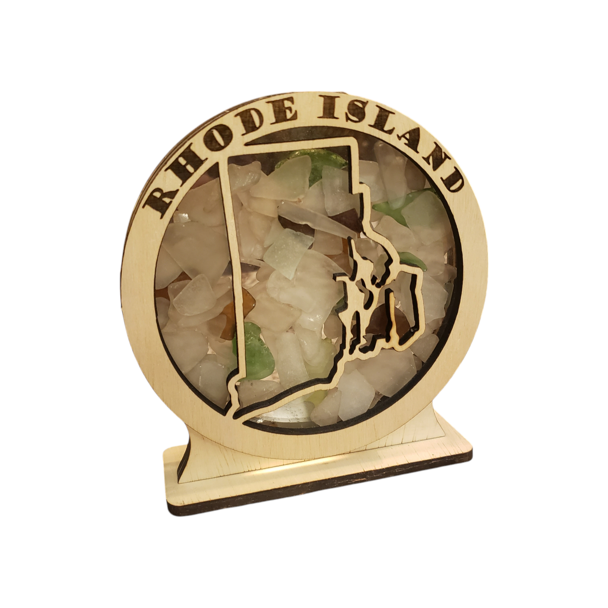 Rhode Island Round Sea Glass Shadowbox Display Single Sided, Window Hanging, Double Sided Shine-through Shelf Sitter, LED Light, Small