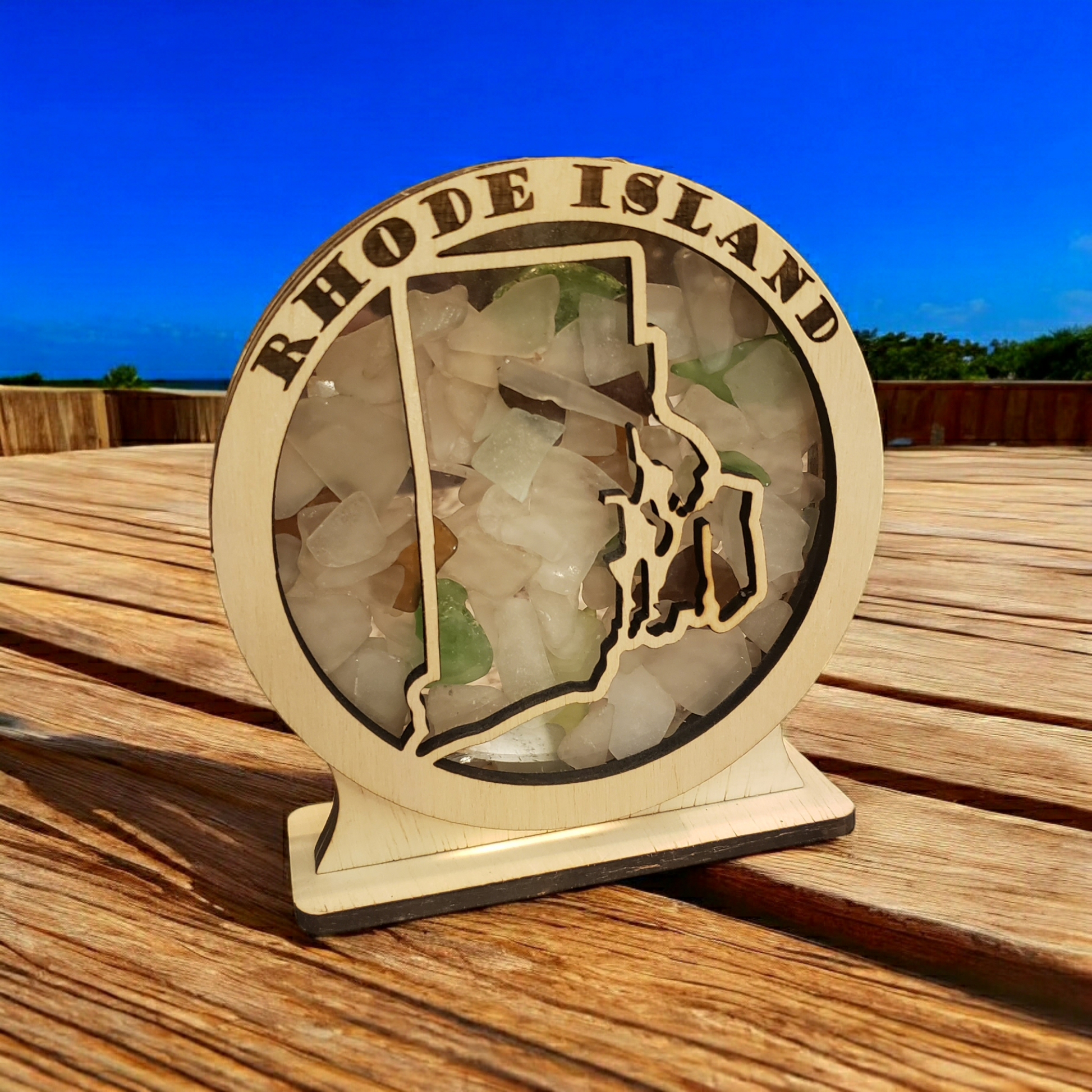 Show off your sea glass collection in this small round shadowbox featuring a detailed Rhode Island outline. Perfect for proud Rhode Islanders and beach lovers, this design beautifully highlights your ocean treasures, adding a coastal charm and unique touch to any space.