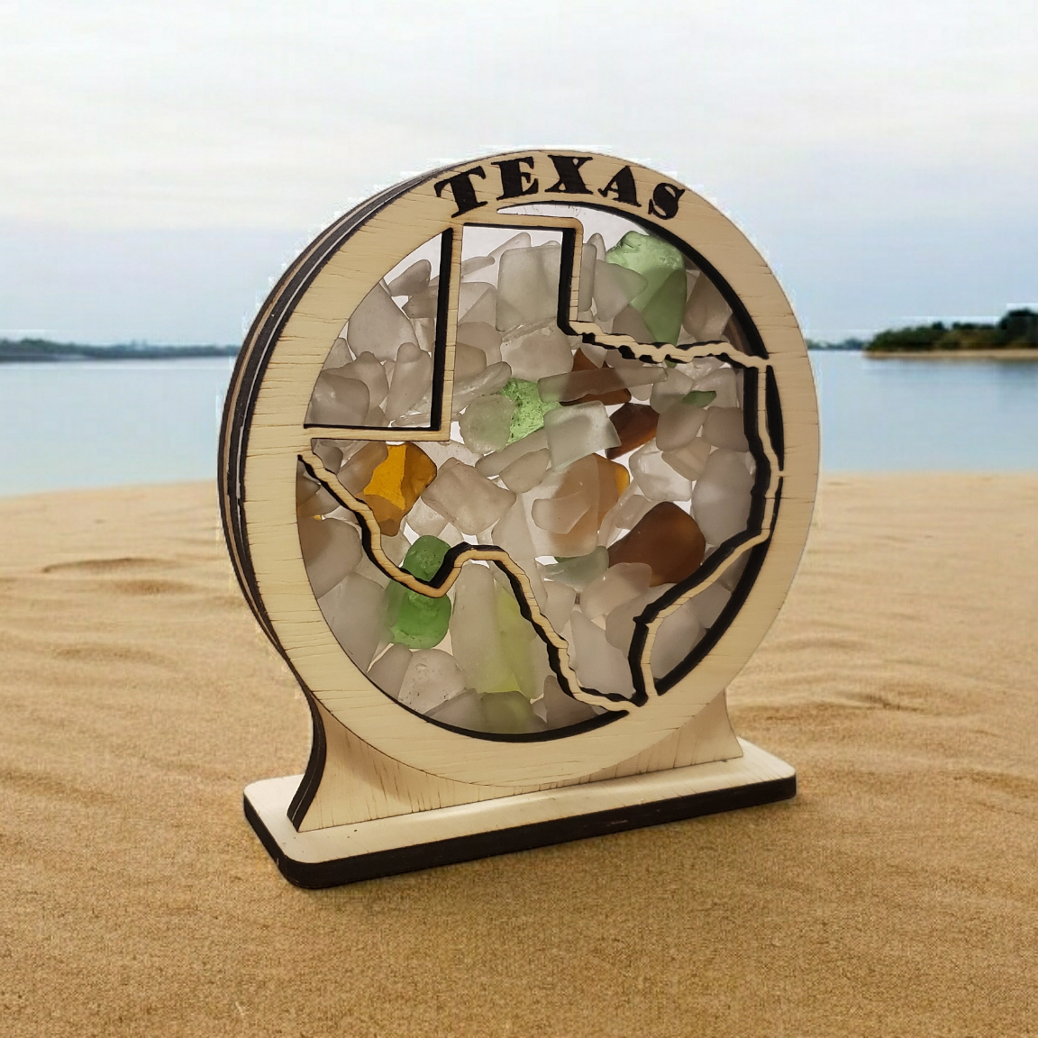 Texas Round Sea Glass Shadowbox Display Single Sided, Window Hanging, Double Sided Shine-through Shelf Sitter, LED Light, Small