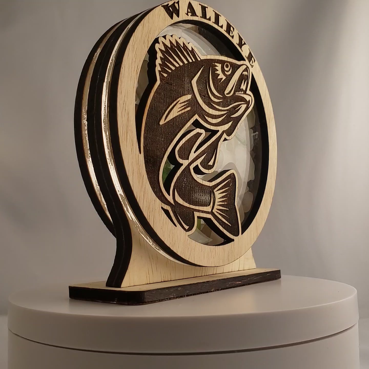 Walleye Sea Glass Shadowbox Display Single Sided, Window Hanging, Double Sided Shine-through Shelf Sitter, LED Light, Small